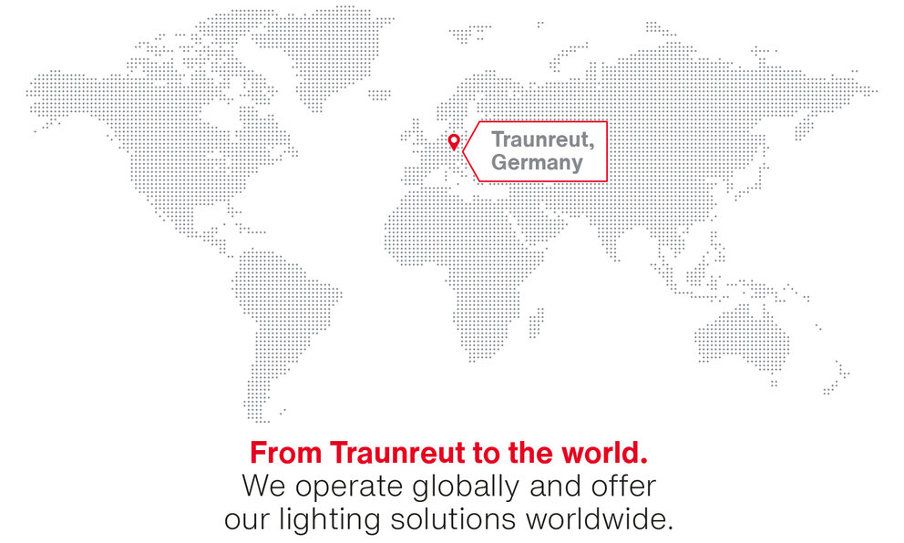 Our lighting solutions are developed and manufactured according to global standards and requirements in Traunreut, Germany. We operate worldwide with sales offices all over Europe, North America, Australia and the UAE.